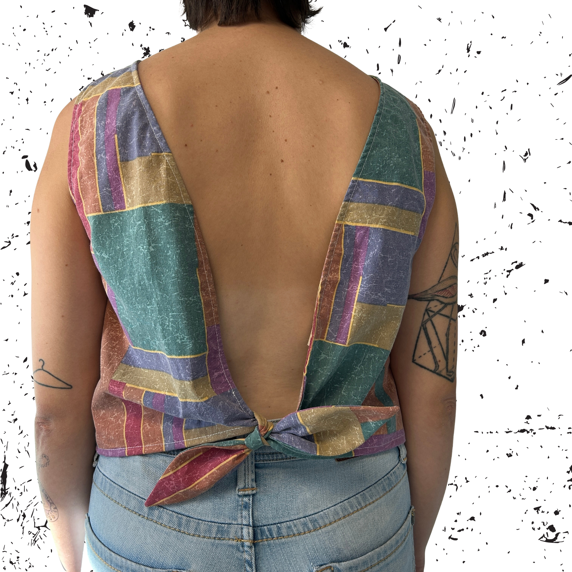 Un top dos nu audacieux en 100% coton upcyclé, se nouant élégamment dans le bas du dos pour un style féminin et raffiné. Parfait pour les journées d'été ou les soirées décontractées.
